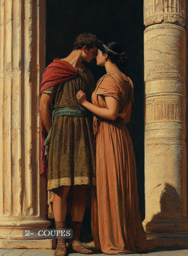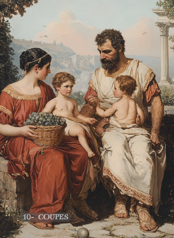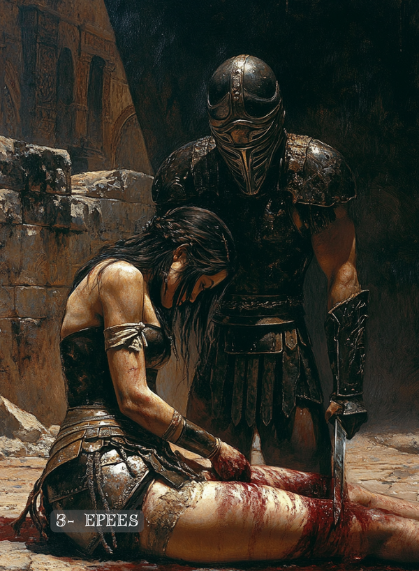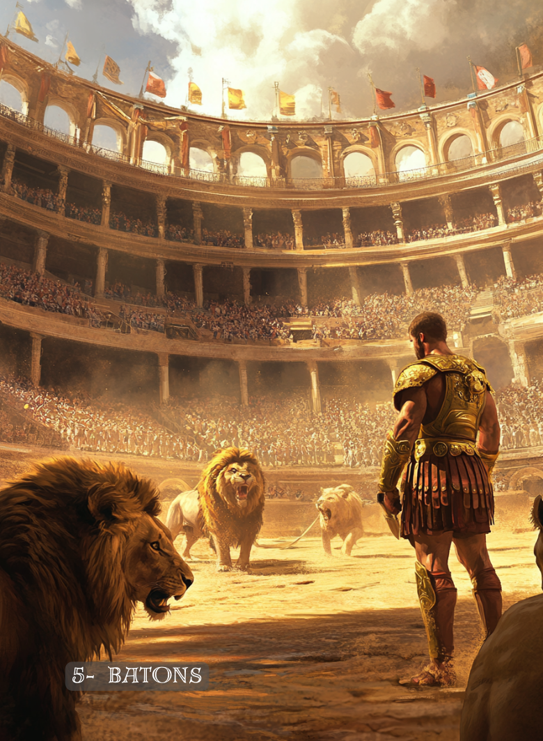 L’Antique est un tarot à l’énergie plutôt sombre, le décor est posé dans la Rome Antique, à travers guerres de l’Empire romain, rites et coutumes qui aujourd’hui peuvent nous paraitre barbares et difficiles, il nous invite à accueillir ce qui “pique”, ce qui est dérangeant, le côté obscur que nous préférons ignorer.
